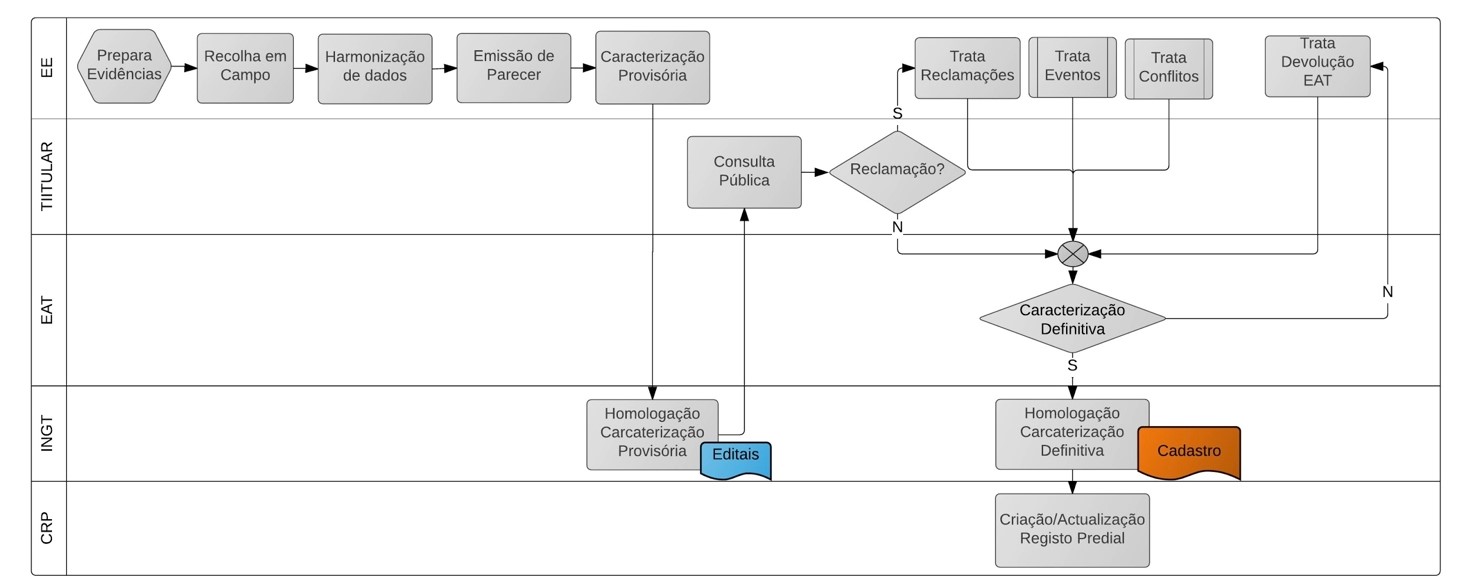 - Demarcações feitas pelos titulares, receção de Declarações de titularidade, revisão e sistematização das informações disponíveis, trabalho de campo com recolha de dados cadastrais incluindo declarações, e harmonização dos dados recolhidos em BackOffice.